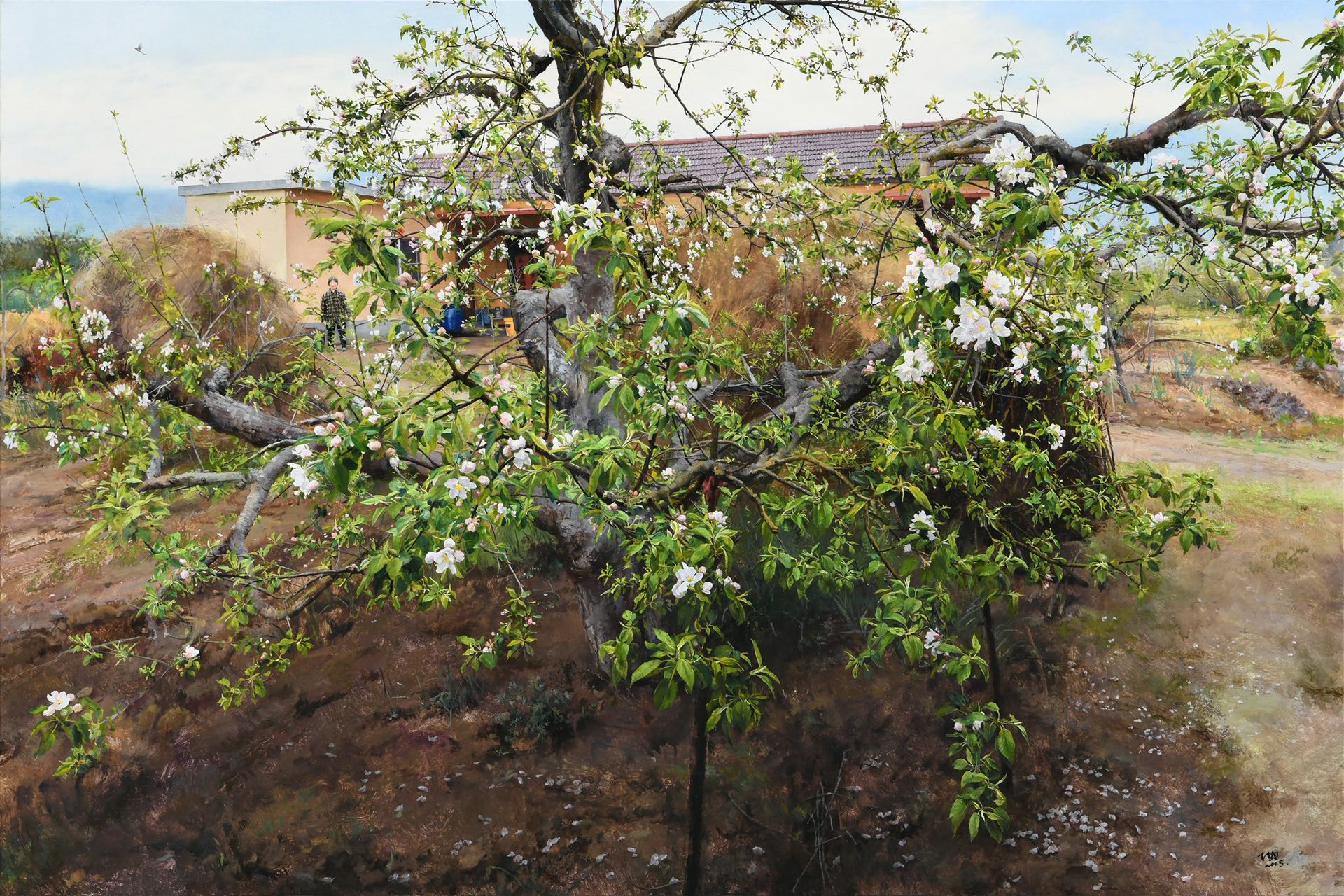 王驰表示,该系列作品以苹果树、果园、果农为创作主体,是我多年来对自然、情感与文化内涵进行深度挖掘与艺术表达的一次实践。《家住幸福地》是2025年夏天新作,这棵老桩苹果树以一种质朴无华的姿态茁壮成长,呈现出清新素雅的气质,彰显着生机与活力,周边的田野与小院房屋在阳光下呈现出金黄色调,散发出质朴的生活情趣。陈帅安表示,油画《启航》以渔业劳作为题材,描绘清晨太阳初升时,渔民们辛勤劳作的场景,展现渔民们在艰苦环境下乐观向上的精神面貌。