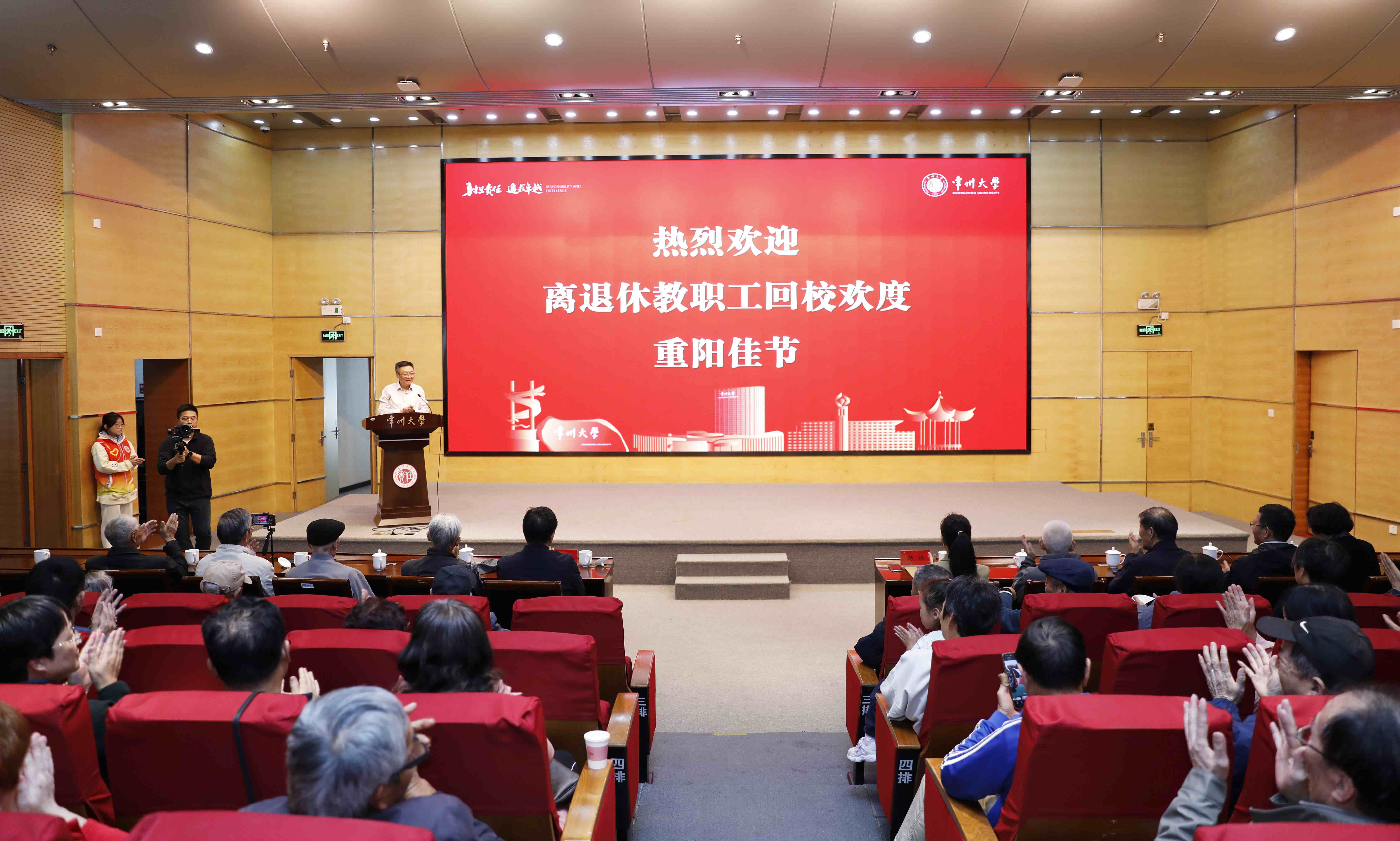 杨琳受党委书记和校长的委托,代表学校党政向现场的老领导、老同志,以及曾经为学校事业发展奉献智慧、付出心血的离退休教职工及家人致以崇高的敬意、诚挚的问候和节日的祝福!她从人才培养、学科建设、师资队伍建设、办学条件持续改善等方面通报了学校近期各项事业的发展情况。她指出,成绩的取得,离不开老一辈打下的坚实基础和一直以来的关心支持,是老一辈们用“勇担责任,追求卓越”的常大精神,铸就了学校发展的根与魂。学校将继续带着责任、带着感情,持续做好老同志的服务保障工作,推进“一人一策”精准关怀,深入开展送学习、送政策、送服务、送健康、送保障、送温暖上门等活动,切实为老同志办实事解难事做好事,努力让各位老同志安享幸福晚年。她希望各位老同志继续发挥“银发力量”,在思想引领、立德树人、智囊参谋等方面继续多提宝贵意见,多献务实之策,共同谱写常大发展的新篇章。