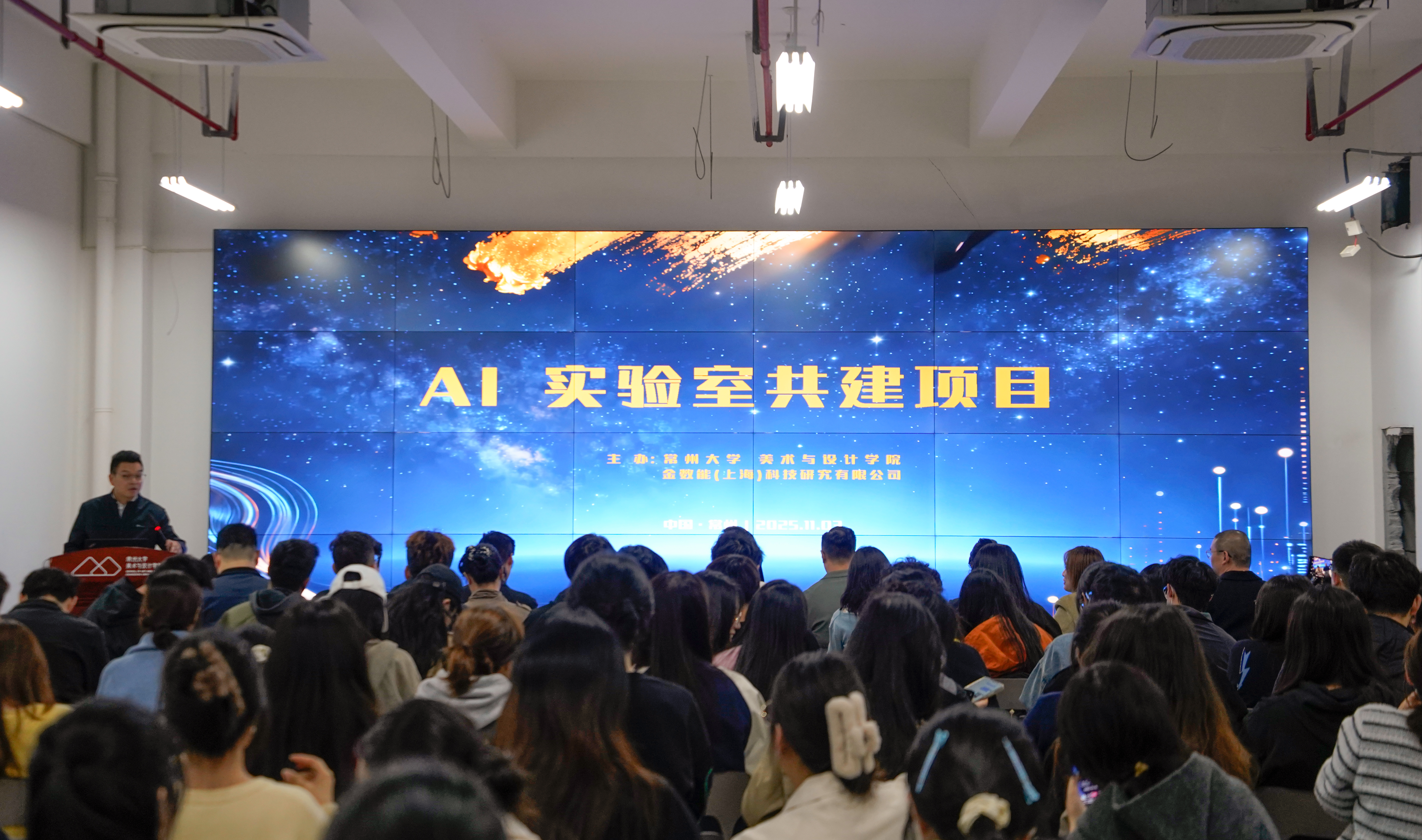 11月3日下午,常州大学美术与设计学院与金数能(上海)人工智能科技有限公司(以下简称“金数能”)共建AI实验室,实验室启用仪式在西太湖校区立行楼报告厅举行。常州大学美术与设计学院党委副书记、副院长(主持工作)贾韬及师生代表100余人出席,金数能CEO陈伟、总工程师夏文渊,江苏博亚建筑设计有限公司总经理袁权等嘉宾莅临,共同见证产学研深度融合重要时刻。