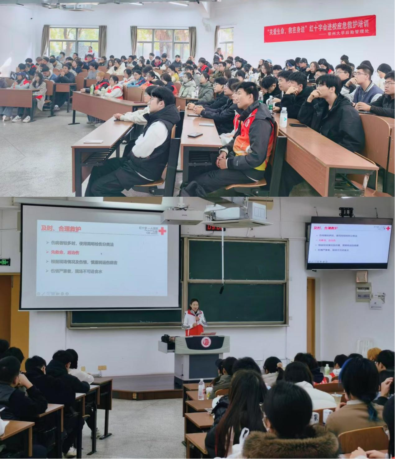为提升师生应急救护能力、筑牢校园安全防线,11月22-23日及11月29-30日,我校联合常州市红十字会在科教城校区及西太湖校区分别开展应急救护初级救护员培训。本次培训特邀市红十字会资深讲师团队授课,采用“理论精讲+实操演练”模式,820名师生及重点人群全程参与学习,系统掌握实用急救技能,均通过考核并取得证书。