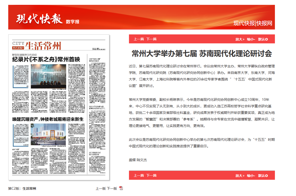 近日,第七届苏南现代化理论研讨会在常州举行。会议由常州大学主办,常州大学瞿秋白政府管理学院、苏南现代化研究院(苏南现代化研究协同创新中心)承办。来自南京大学、东南大学、河海大学、江南大学、上海社科院等省内外单位的20余位专家学者围绕“‘十五五’中国式现代化新议题”展开研讨。