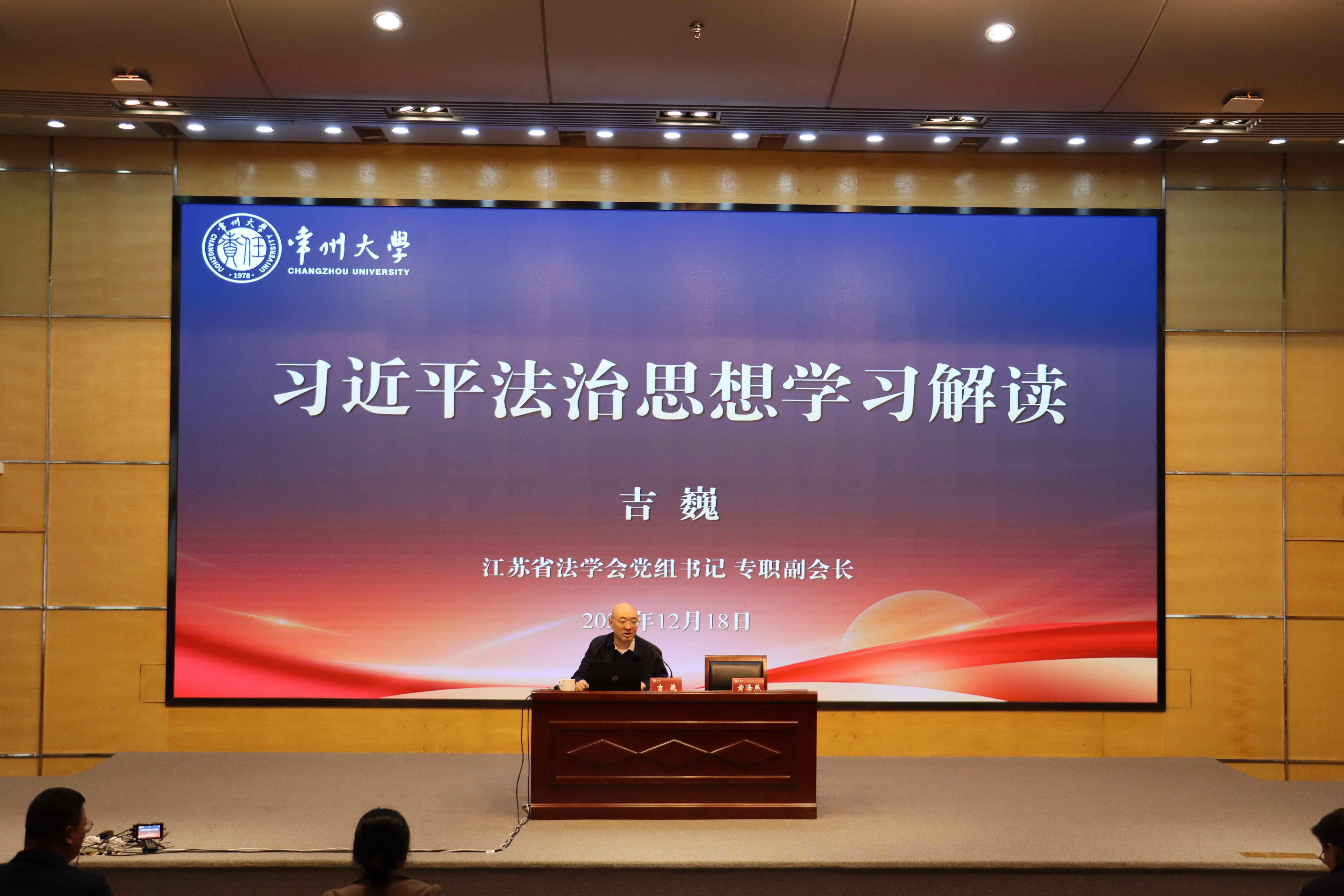 12月18日下午,江苏省法学会党组书记、专职副会长吉巍走进常州大学,在科教城校区文彰楼报告厅以“习近平法治思想学习解读”为题,为常州大学师生讲授专题思政课。江苏省法学会研究处处长吕复栋、常州市法学会专职副会长朱帅、学校相关职能部门和马克思主义学院负责人、思政课教师代表,以及本科生、研究生代表200余人现场聆听讲座。校党委副书记黄海燕主持讲座。
