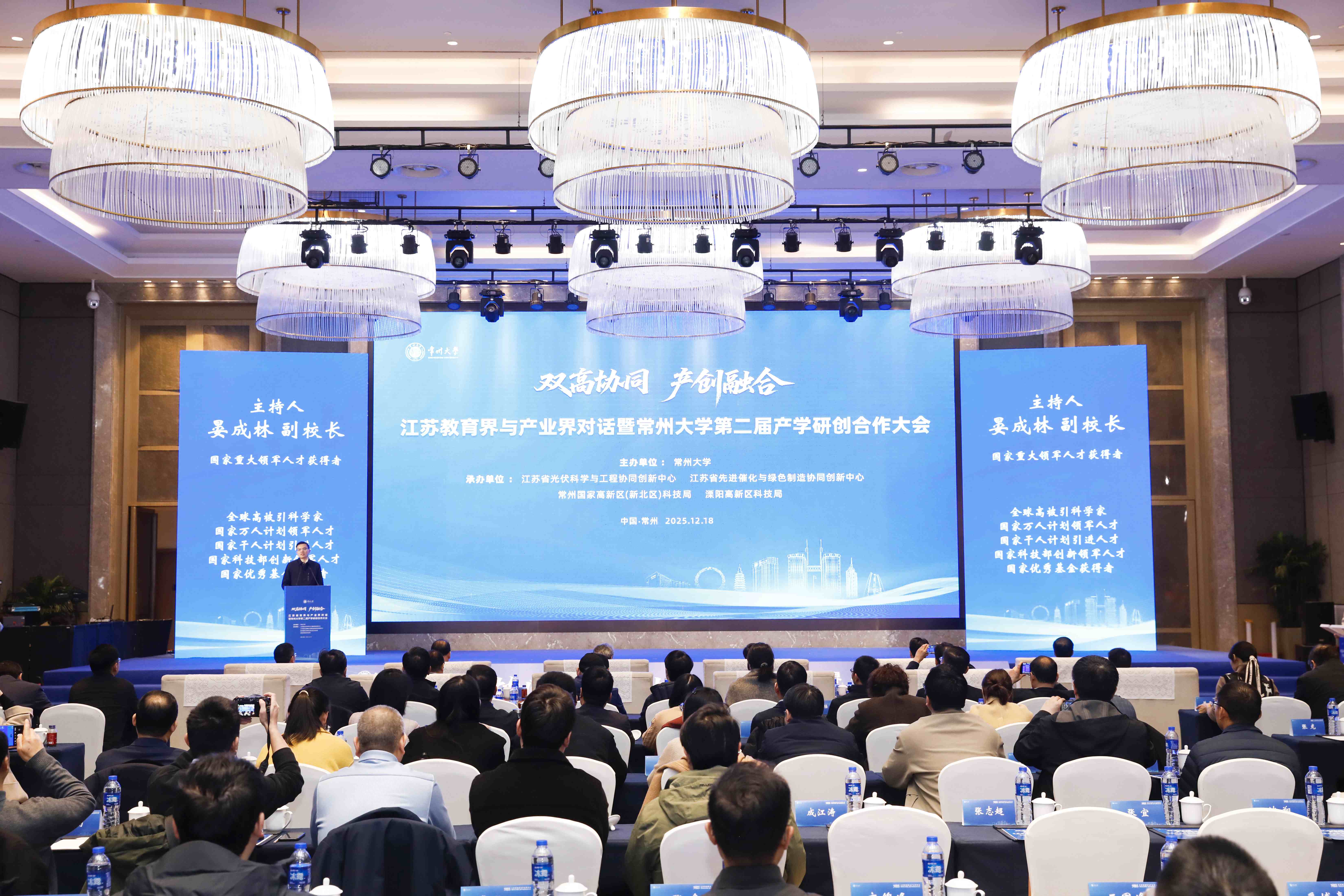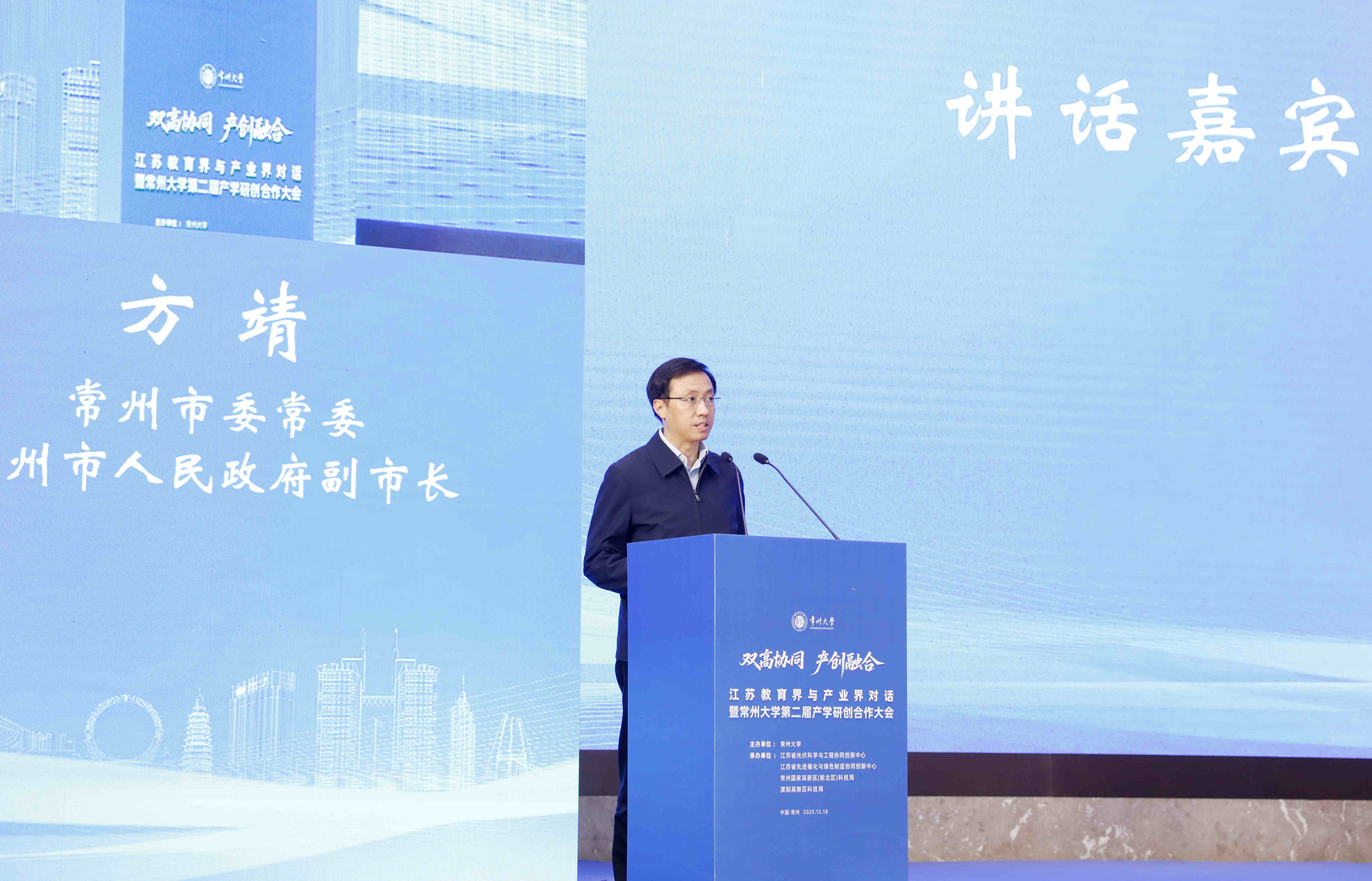 12月18日上午,以“双高协同·产创融合”为主题的江苏教育界与产业界对话暨常州大学第二届产学研创合作大会在常州举行。常州市委常委、副市长方靖,常州市科学技术协会主席任洪兴,中石油蓝海新材料(通州湾)有限公司副总经理劳国瑞,中国石化扬子石油化工有限公司副总经理曹云波,中国石化集团南京化学工业有限公司副总经理江洋洋,中国石化金陵分公司副总经理姜来,中国石化仪征化纤股份有限公司副总经理陈志明,中国石化集团南京工程有限公司高级专家谢东升,常州大学党委书记徐守坤,党委副书记、校长陈海群,党委常委、副校长李亚飞,副校长晏成林出席会议。来自政府部门、产业园区、合作企业的200余名代表参加会议。晏成林主持会议。