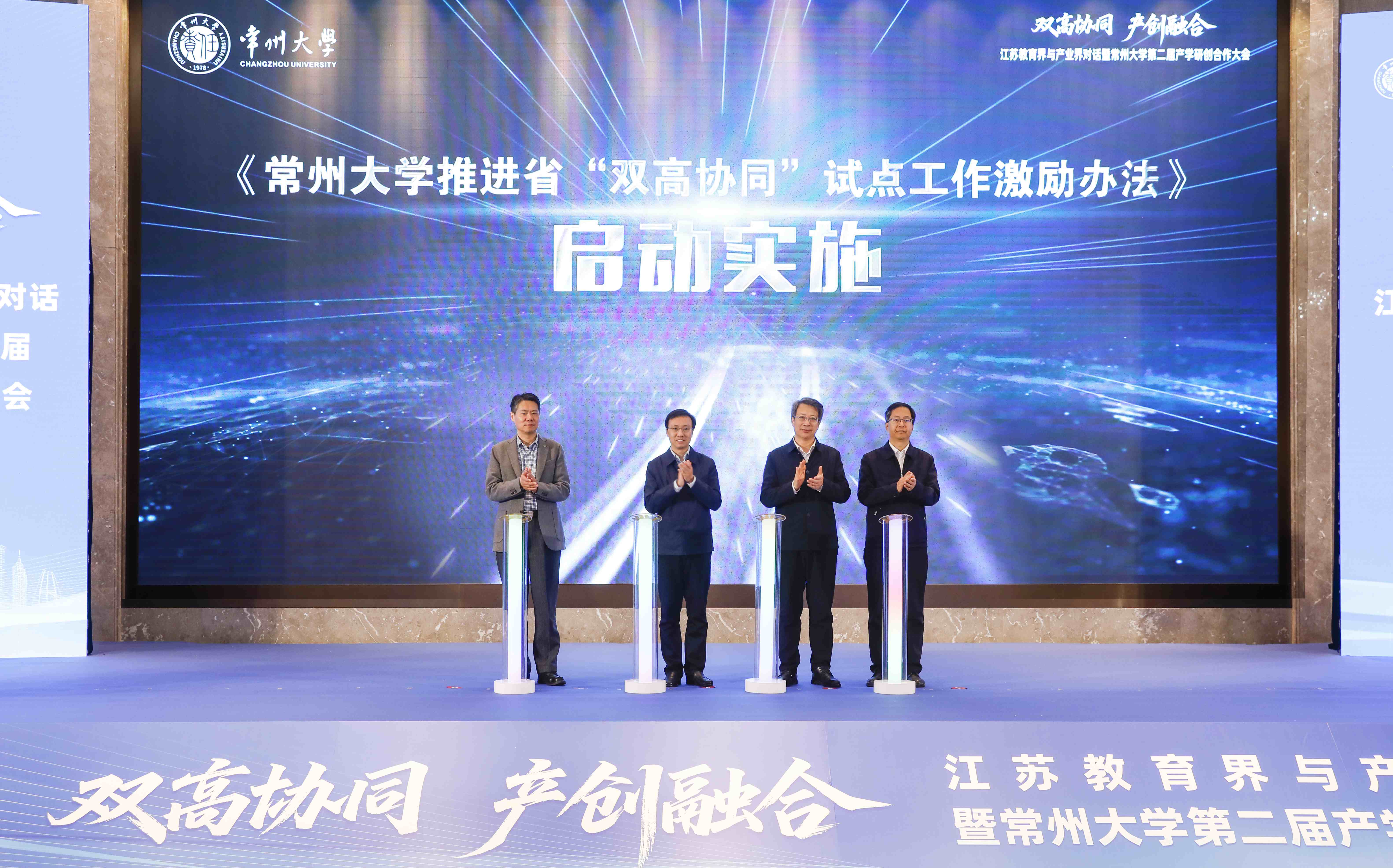 方靖、徐守坤、陈海群、劳国瑞共同为《常州大学推进省“双高协同”试点工作激励办法》正式启动实施。该办法的实施将进一步释放学校创新活力,加速教育、科技、人才资源向产业一线集聚,推动“双高协同”制度优势转化为高质量发展动能,形成“创新链—产业链—人才链”深度融合的良性循环,为江苏“1650”产业体系和常州“1028”产业蓝图的落地提供坚实支撑,为“双高协同”试点工作的深化积累宝贵经验。
