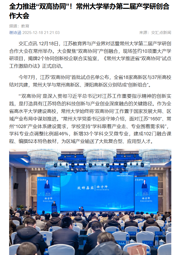 12月18日,江苏教育界与产业界对话暨常州大学第二届产学研创合作大会在常州举办。大会聚焦“双高协同”产创融合,现场签约10项重大产学研项目,揭牌2个协同创新校企联合实验室,《常州大学推进省“双高协同”试点工作激励办法》正式启动。