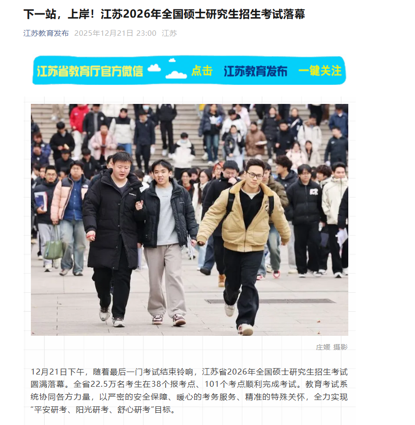 12月21日下午,随着最后一门考试结束铃响,江苏省2026年全国硕士研究生招生考试圆满落幕。全省22.5万名考生在38个报考点、101个考点顺利完成考试。教育考试系统协同各方力量,以严密的安全保障、暖心的考务服务、精准的特殊关怀,全力实现“平安研考、阳光研考、舒心研考”目标。