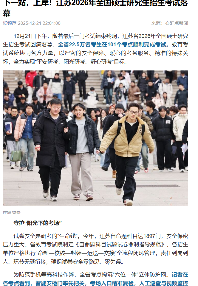 12月21日下午,随着最后一门考试结束铃响,江苏省2026年全国硕士研究生招生考试圆满落幕。全省22.5万名考生在101个考点顺利完成考试。教育考试系统协同各方力量,以严密的安全保障、暖心的考务服务、精准的特殊关怀,全力实现“平安研考、阳光研考、舒心研考”目标。