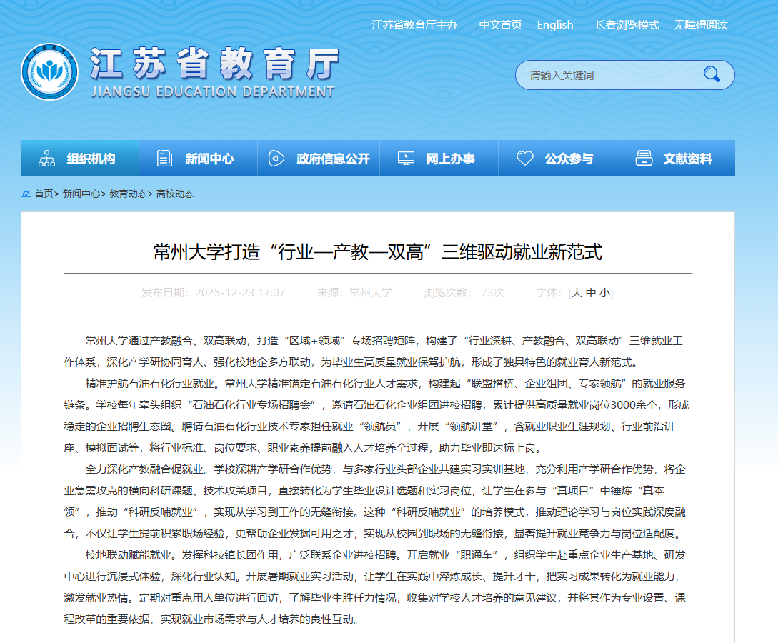 常州大学通过产教融合、双高联动,打造“区域+领域”专场招聘矩阵,构建了“行业深耕、产教融合、双高联动”三维就业工作体系,深化产学研协同育人、强化校地企多方联动,为毕业生高质量就业保驾护航,形成了独具特色的就业育人新范式。