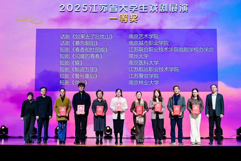据悉,本年度获得特等奖、一等奖及部分二等奖的作品将纳入2026年度江苏省“高雅艺术进校园”节目库。明年春天,还将举办大学生戏剧展演活动优秀剧目展演周,开展专场展演、主题沙龙、高校戏剧社团巡礼等活动。(通讯员/张欢欢 审核/唐琳 编辑/庄媛)