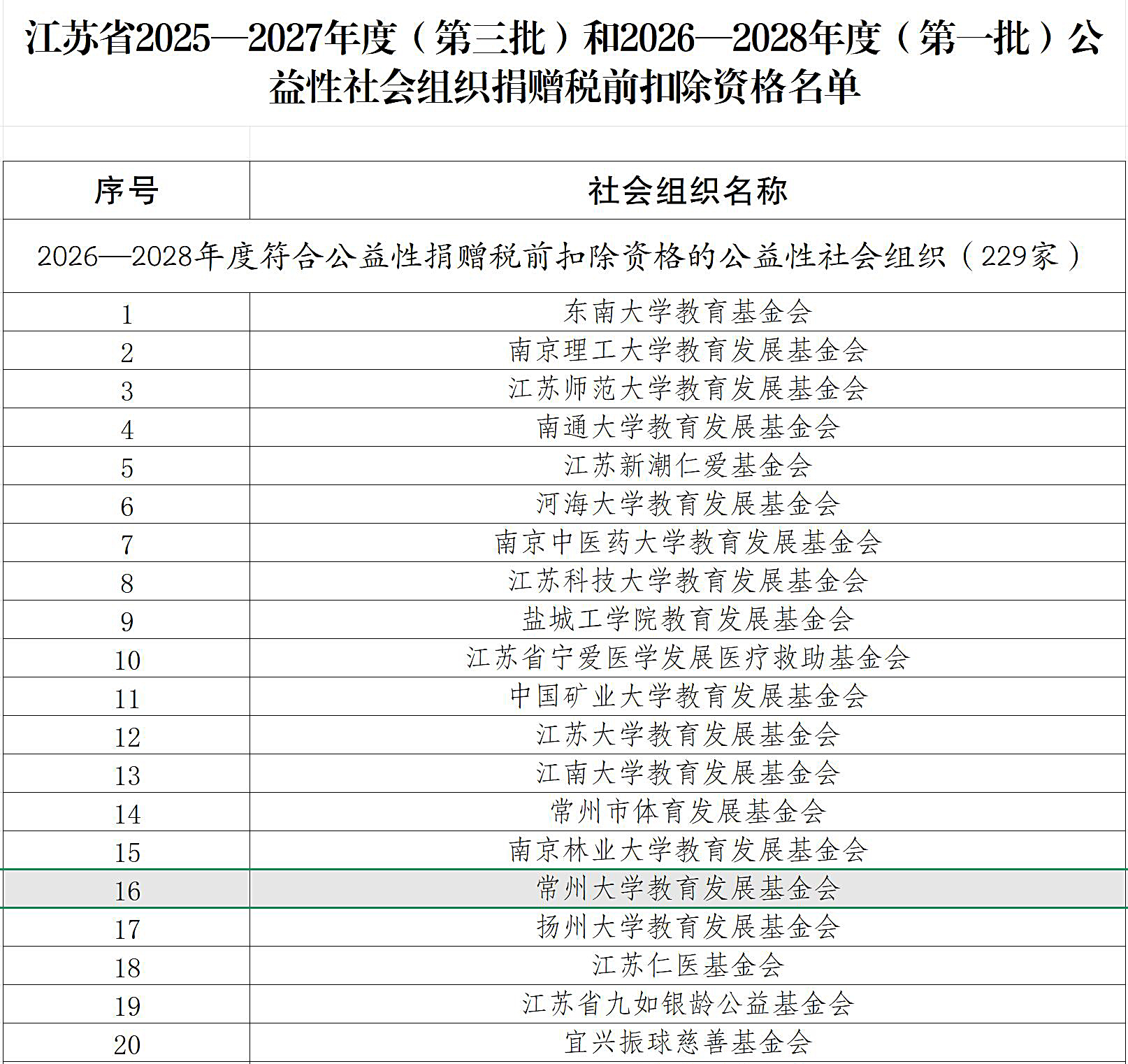 近日,根据江苏省财政厅、国家税务总局江苏省税务局、江苏省民政厅联合印发的《关于江苏省2025—2027年度(第三批)和2026-2028年度(第一批)公益性社会组织捐赠税前扣除资格名单的公告》苏财税〔2026〕1号,常州大学教育发展基金会获得公益性社会组织捐赠税前扣除资格,有效期为三年(2026-2028年)。