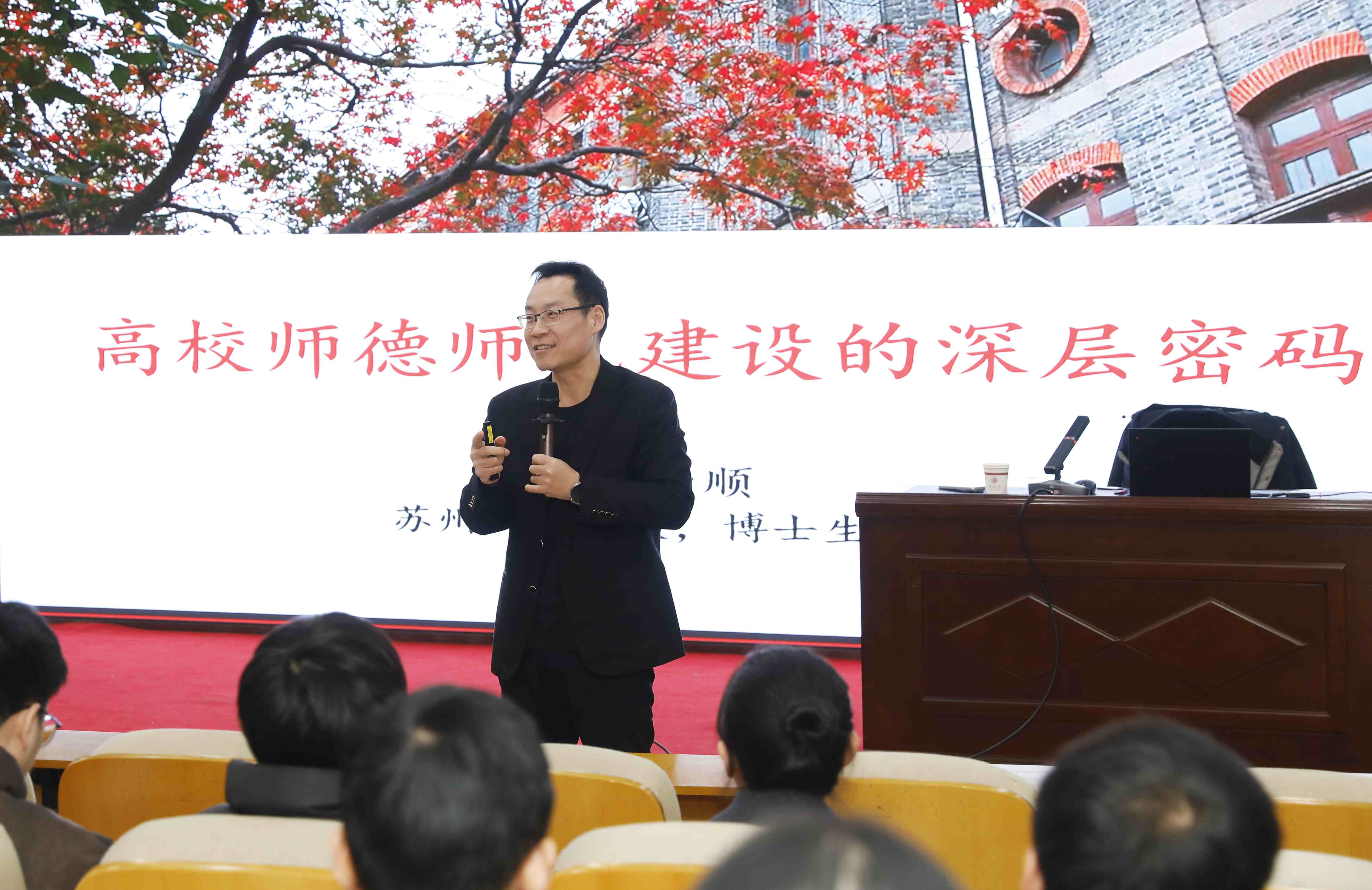 会后,全国德育学术委员会理事,国家社科基金重点项目首席专家,叙事德育模式代表学者,苏州大学李西顺教授以《高校师德师风建设的深层密码》为题作专场讲座。李西顺聚焦“德”字根本,阐释了教师应“育四心,避三心”的育人理念,并从“大学之道”切入,强调为师者须先“定”心而后有所得。他从内在心性、人际交往、思维习惯、行为习惯、耻感文化、君子之风等维度,系统阐述了高校仁爱之师锤炼精神风貌的路径与方法,为新时代教师涵养育人修养、强化使命担当提供了深刻启示。