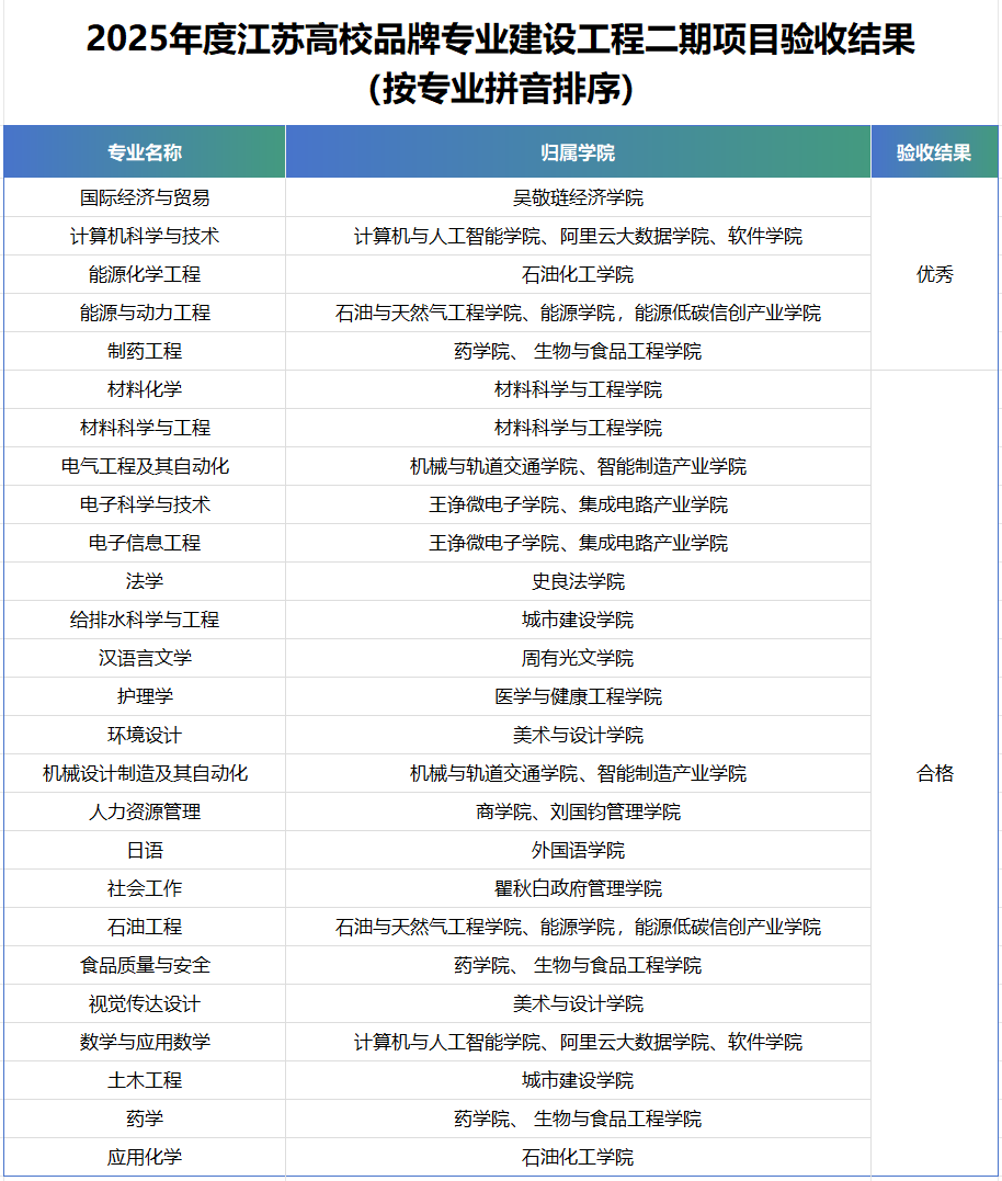 12门课程入选第三批国家级一流本科课程,其中线上一流课程2门、线上线下混合式一流课程5门、线下一流课程3门、社会实践一流课程2门,获批率位列全省第10位。目前,我校已有国家级一流本科课程31门、江苏省一流本科课程40门、省级产教融合型一流课程5门,在省内高水平B类建设高校中处于领先地位。26个专业通过2025年度江苏高校品牌专业建设工程二期项目验收,其中国际经济与贸易、计算机科学与技术、能源化学工程、能源与动力工程和制药工程等专业验收结果为“优秀”,优秀数量位列全省并列第一。获批省级工业软件学院,江苏省教育厅、省工业和信息化厅公布省级工业软件学院建设高校名单,全省15个建设高校,我校位列其中。