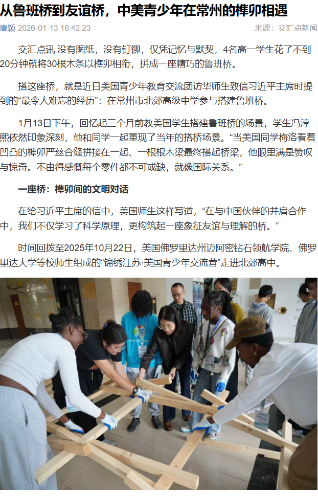 搭这座桥,就是近日美国青少年教育交流团访华师生致信习近平主席时提到的“最令人难忘的经历”:在常州市北郊高级中学参与搭建鲁班桥。