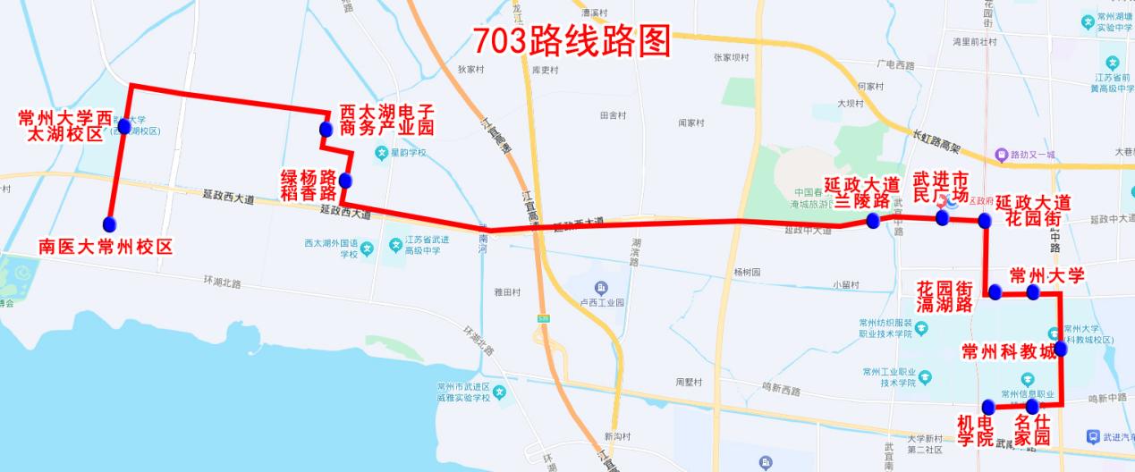 703路:由机电学院始发,经由名仕佳园、常州科教城、常州大学武进校区、花园街滆湖路、延政大道花园街、武进市民广场、延政大道兰陵路、绿杨路稻香路、西太湖电子商务产业园、常州大学西太湖校区,抵达南京医科大学常州校区。每天2个车次,早班车7:30,晚班车18:00。(周一至周六运营,周日及国家法定节假日停运)