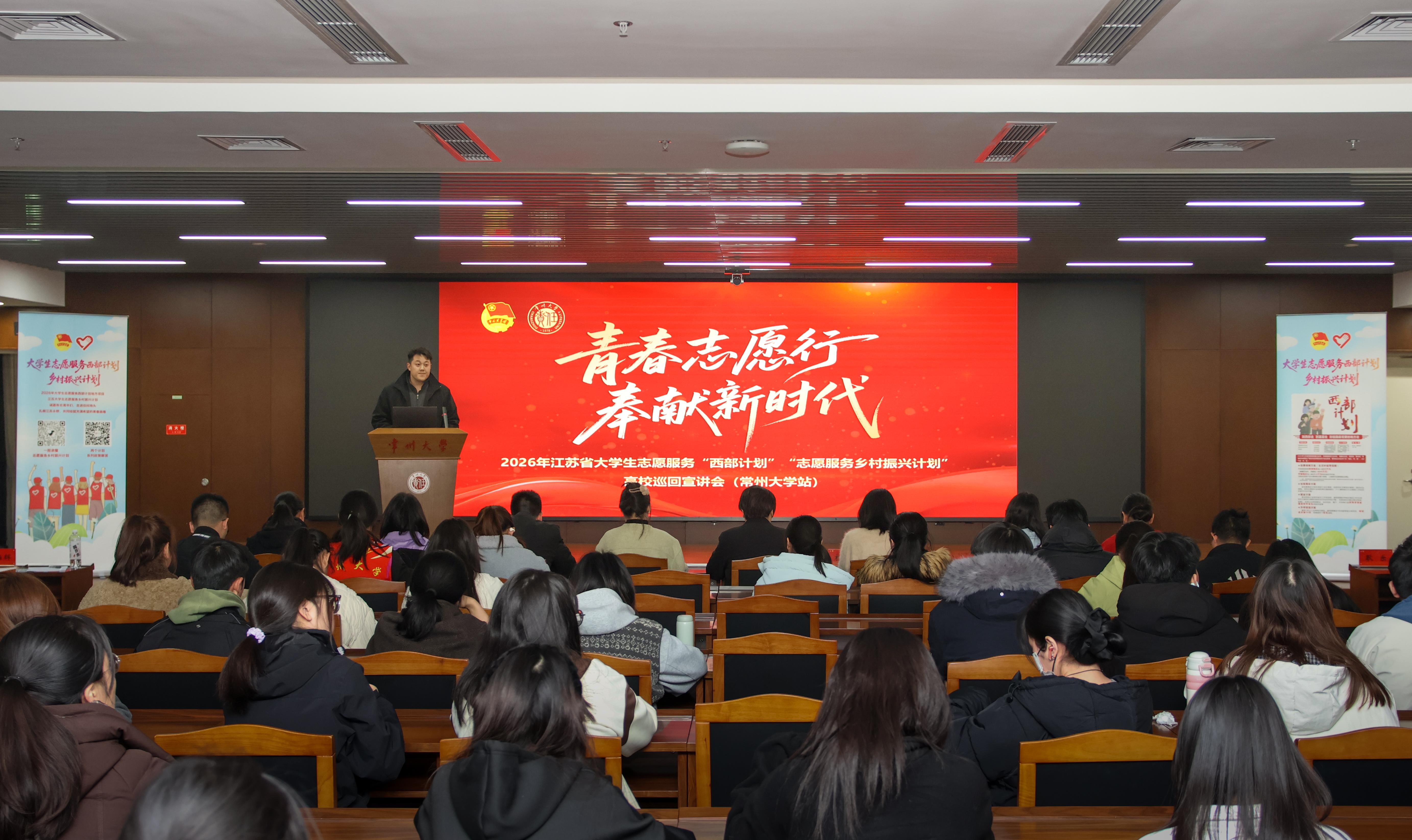 为深入学习贯彻习近平总书记给谢依特小学戍边支教西部计划志愿者服务队全体队员重要回信精神,广泛动员和积极引导优秀高校毕业生铭记殷切嘱托、投身西部基层、奉献青春力量,3月26日,学校举行“青春志愿行 奉献新时代”2026年江苏省大学生志愿服务“西部计划”“志愿服务乡村振兴计划”高校巡回宣讲会。团省委二级巡视员施静芝,团省委社联部(志工部)工作人员蔡雪,武进团区委副书记杨琳,江南大学研究生支教团志愿者广茂池、张佳慧,我校校友、常州市乡村振兴计划志愿者窦心言、耿乐,学生处、团委相关负责人,部分大四毕业生、在读研究生,以及意向报名参加“两个计划”的志愿者代表参加活动。